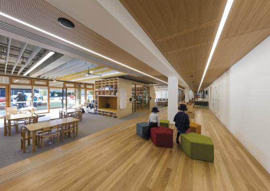 The brief required a variety of differently scaled spaces incorporating technology to suit small children. Movable screens and joinery including shelving, built-in seats and withdrawal spaces enable different teaching configurations. An elevated central spine called the bridge connects the length of the space and provides additional learning spaces. Two small group withdrawal spaces are the only enclosed areas and form a central component of the free-standing joinery elements. Transparent administration areas are visible to the school community. To increase daylight and natural ventilation, the ground floor brick facade was demolished and replaced by high-performance timber-framed double-glazing, with large bi-fold doors opening to the timber deck.