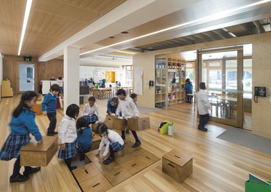 This is a new primary school reusing a 1970 three-storey former Telstra training centre. The design brief was to create an inspirational educational space that provides flexible, open learning spaces to suit small children and accommodate a high level of technology. Timber was fundamental to achieving this, it plays the critical role in producing a warm and natural environment that counterbalances the partially-exposed concrete structure of the building. Timber floors and acoustic ceilings, movable screens, joinery that includes shelves, built-in seats and withdrawal spaces, enable different teaching configurations. The design boldly removes all fixed walls between three teaching spaces. All spaces are connected by a central timber spine created by elevating a ‘bridge’ one step above all other spaces. In the context of a school the true innovation here is in the flexible space and the use of timber as the primary material.