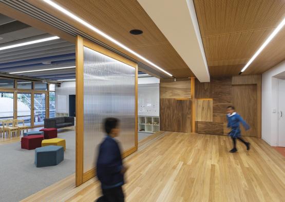The design approach was to provide flexible, open learning spaces and to create a warm atmosphere. This was achieved through using timber as the main material in floors, wall panelling, ceiling and joinery, timber produces the warm and welcoming environment. Using minimal colour and predominantly timber provided a calm background for learning.