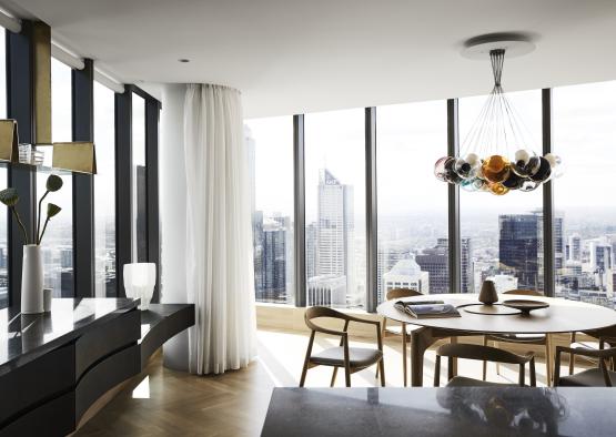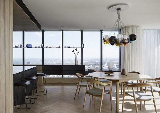 The brief was to retrofit a 56th floor apartment at Freshwater Place in a way that better reflected our clients’ personalities and interests. The spaces were to feel calm yet joyful. Timber has been used as a primary material on both the floor and wall linings and provides a warm backdrop to the city and bay views. Against these neutral surfaces, moments of colour, pattern and texture are used to reflect individuality and provide surprise. A custom timber wall lining features heavily. Displaying classic components of traditional timber-turning verging on decorative but simplified by their precise lines and repetition. A herringbone motif ties all the floor surfaces together, carried out primarily in timber parquetry.