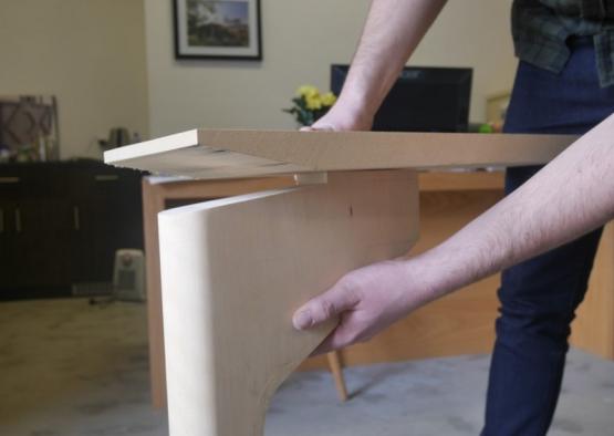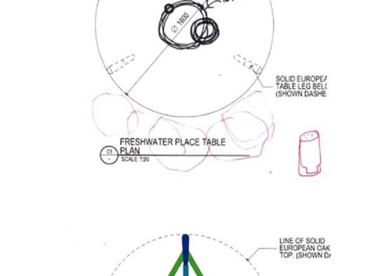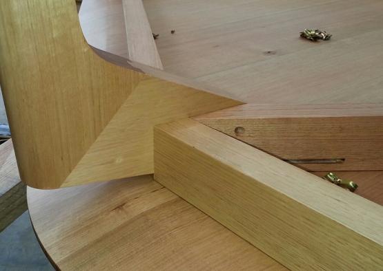 This table further develops ideas that have been explored in dining tables designed for our houses over many years. Its round shape responds to the curved building façade that defines the dining room. The table top is finished to a narrow profile and appears to float freely from three legs. The legs are gently curved and tapered down in size to touch the floor lightly.