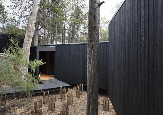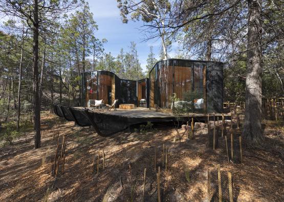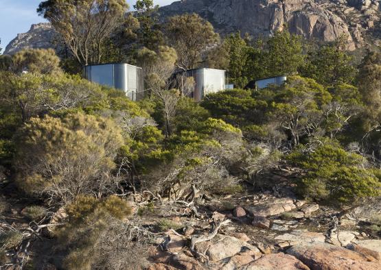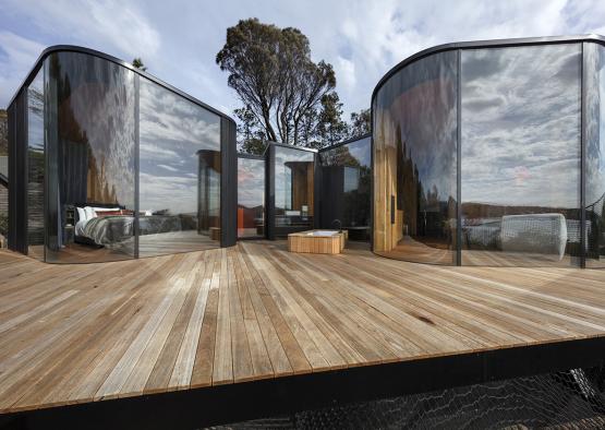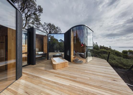 The biggest challenge for extending the existing Freycinet Lodge was to maintain the subtle intervention on the National Park. Organic forms perch on the clifftop landscape, mimicking the surrounding rock formations of the site context. Charred ironbark cladding and curved glass walls ensure a light aesthetic that blends with the earth. The charred ironbark was chosen for its ember proofing, durability and textural qualities, forming a resilient protective envelope around the structure. Grey Gum timber boards clad the sweeping deck that weaves between the pods, housing viewing platforms and outdoor baths.