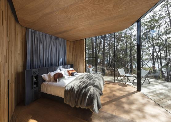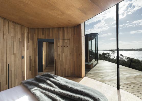 The interior of the cabins continues the timber theme from the outside. A mixture of local timbers, from Tasmanian Oak and Blackwood, to locally crafted Tasmanian Oak-veneer plywood make up the warm interiors. Oak offcuts provide a sculptural cladding pattern. Timber and glass almost entirely make up the interior palette. The extensive use of curved glazing creates the organic form of the cabins, stimulating the interior-exterior relationship of the structure. As the glass wraps around corners, the result is a space that feels to be semi open to the environment, but with the comfort of an enclosed space. The plywood ceilings are light and earthy, nestling the inhabitants beneath nature. The sheets were finished with a natural stain.