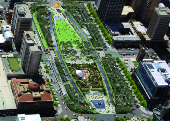 • Improvements to the central roadway so that it can be transformed into a temporary plaza for large events, parades and festivals