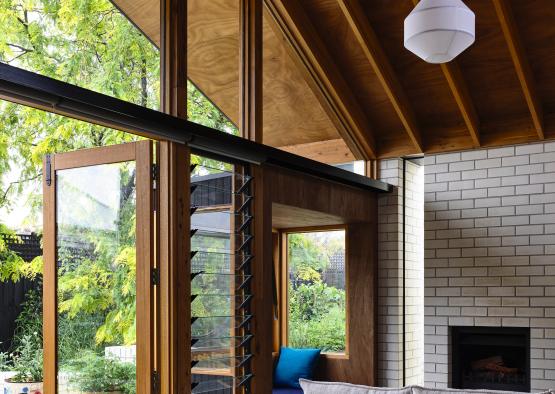 The zig-zag roof canopy of exposed timber beams and hardwood plywood is the major gesture in the new progression of spaces. Open plan kitchen, living and dining spaces anchor around a fireplace and sculptural curved brick wall, which creates the distinction between the public spaces and the more private sleeping and bathing spaces beyond.