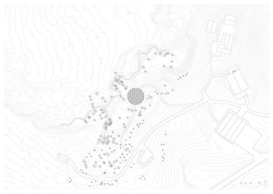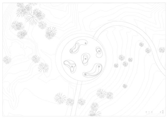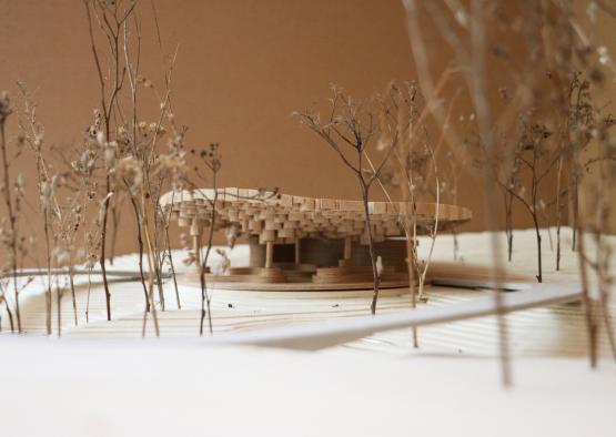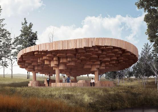 As it is entirely carved out of wooden logs, the pavilion extends a symbolic invitation to confront the wildest part of nature- the heart of the raw tree. The logs are displayed in their bare form, becoming exterior, interior, and structural material. The singular materiality creates a cohesive and simplistic structure with a natural and expressive feel.