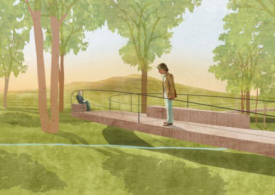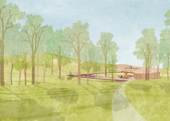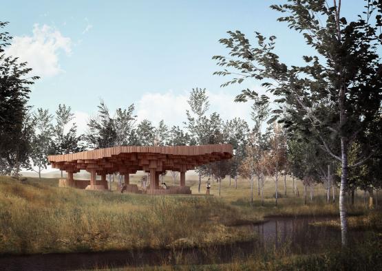 Under the canopy of the pavilion will be a space reminiscent of the cool, dappled shading of a forest. The form is designed to emphasise the magical views of the surrounding landscape, consisting of mountains, creeks, aspen trees and sculptures.