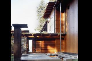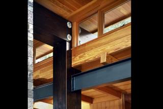 Extra pieces of the salvaged timbers were used as light totems at the entrance to the house. Behind is a storage building, clad in the vertical cedar siding to match the house. Exposed wood surfaces were Sikkens stained, with a latex stain inside.