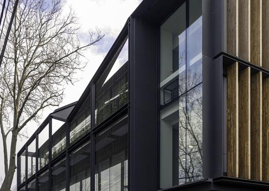 Engineered timber was used to introduce the warmth and rawness of timber but at a scale that was suitable to the design. The timber had to be able to span a full level of the building between the steel angles where it would be restrained.
