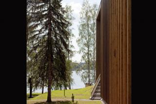 Featuring a very typical Finnish setting amongst numerous birch and spruce trees, and along a lakefront setting, the building sits elegantly thanks not only to the relentless use of wood but its subtle curved overall forms and delicate cladding details. Allowing the surrounding forest to penetrate the bounds of the building through these subtle gestures – in conjunction with more rigid formal cuts decorated in highly reflective glass surfaces – the visual impact of the building on its historical context has been greatly limited.