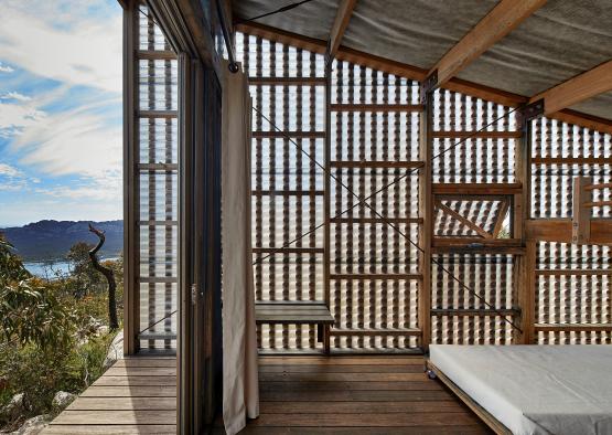 The use of blackbutt timber for the cladding in the GPT Stage 2 hiker shelters, camp huts, and amenities was due to timbers high strength to weight ratio, durability in its natural form, and ability to create prefabricated modules. These factors were important to the design as due to the site’s remote locations and extreme weather conditions; materials were often helicopter lifted to site and where ongoing maintenance would be limited.
