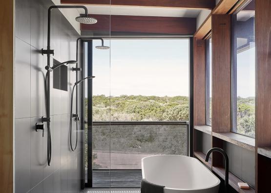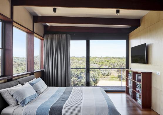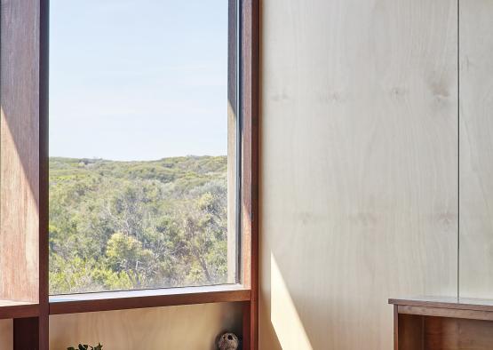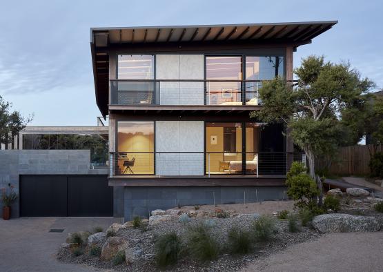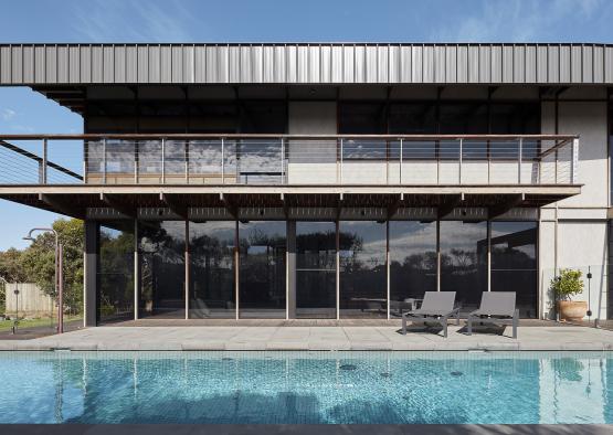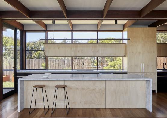The recycled ironbark structural portal frames divide the façade into bays, creating a meditative rhythm within this family home, located in the Bellarine Peninsula town of Barwon Heads.