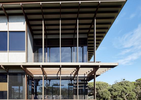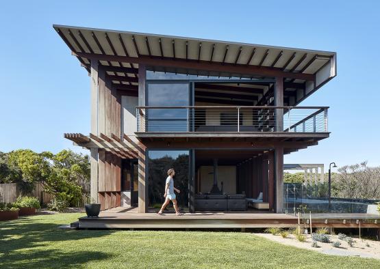 Exposed grey ironbark framing creates a rhythmic and hardy facade for a coastal dwelling.