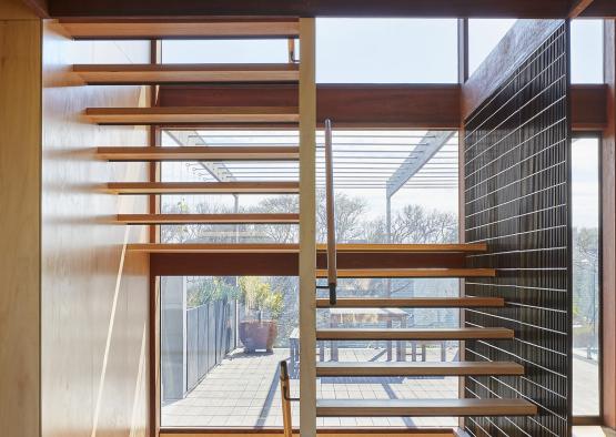 The interior spaces are protected from overheating by the overhanging eaves and vertical timber screens.