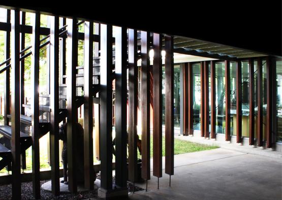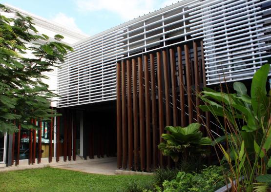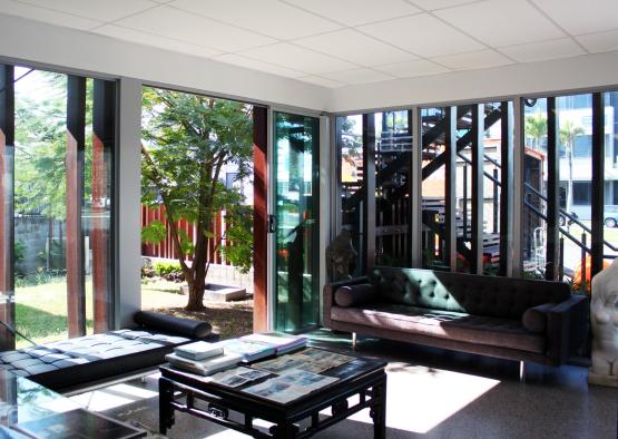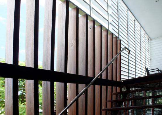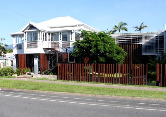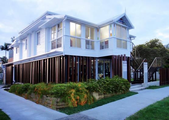 These refurbished premises at 128 Spence Street, Cairns are the home of Edgearchitecture and StudioEdge Pilates. The original house, constructed in 1800 by John Griffiths, has been reinvigorated to showcase the resilience of timber in time. The refurbishment rearranged the original house on the site to accommodate a new showroom on the ground floor, offices above, a landscaped courtyard and the Pilates Studio. Here the project is grounded in preservation while providing a contemporary statement in a modern context that is not bound by the buildings age. There is a quality of duality between the old timber building and timber fenestration enveloping the new, forming a language that binds th entire building. A tree planted in the courtyard garden during construction reflects the endurance and displays the varied benefits of wood and timber.
