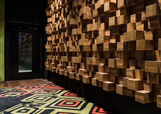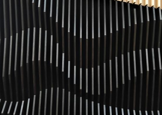 The CLT panels in the performance space walls were lined with acoustic diffusion paneling, so did not require stringent appearance criterion. The CLT offcuts were sculpted into a modulating pattern for the Recording Suite and Salon diffusion panels. The timber panel arrangement consists of repeated modules rotated and randomly applied, evoking minimalist music notation methods. These patterns exposed the structural layering of timber in the CLT, allowing the material that would otherwise be hidden to be showcased.