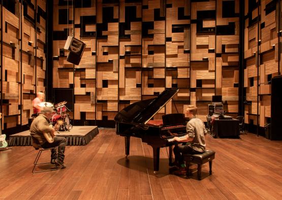 The modulating timber wall panels of the Salon and Recording Suite minimise the cost and environmental impact of the performance venues, while providing optimal acoustic experiences. The rough sawn recycled timber from the previous Hedberg Garage and the perforated plywood provide diffusion of high frequency instruments, while the larger proportion of the space caters to low frequency sounds.
