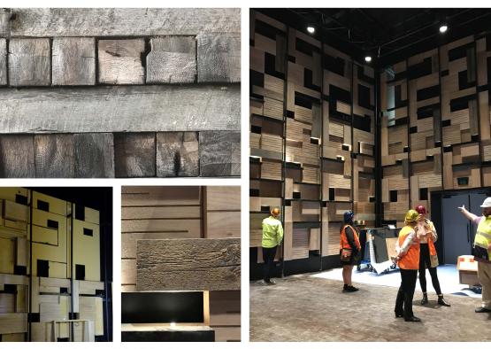Materials and artefacts such as the Oregon structural beams of the Hedberg Garage warehouse were salvaged from demolition and archaeological excavation. The salvaged timber was recycled to make use of the existing rough sawn texture for acoustic diffusion and to also integrate stories of the history of the site within the building.