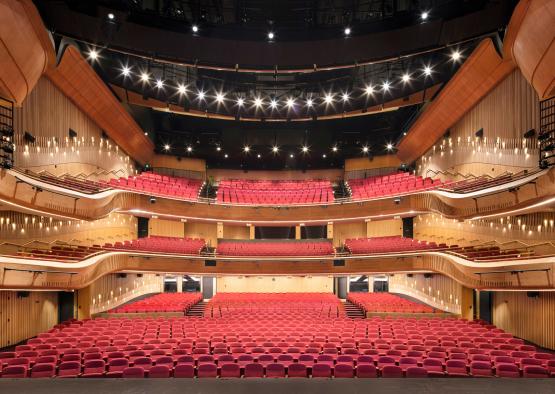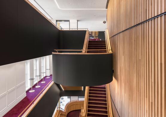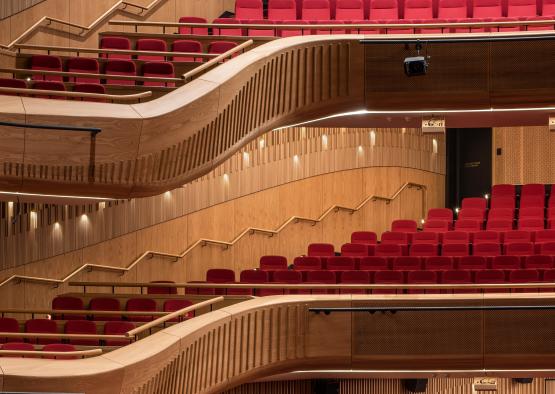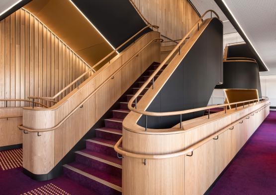 The complex geometry of the timber dress circle, the intricate detailing of the solid and veneer timber wall panelling, and the cascading ribbon stairs are all tied in with the musical theme, inspired by wooden instruments.