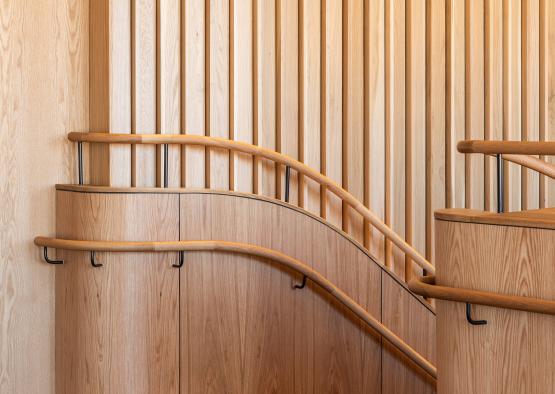 Cox drew influence from the curved lines of the original 1913 heritage plans, inserting bold new curving balconies. Despite being made from planar timber elements, the organic curves of the striking new balcony are well suited to timber. Thin profile timber can readily be formed into curve-like shapes, giving the impression of fluid movement.