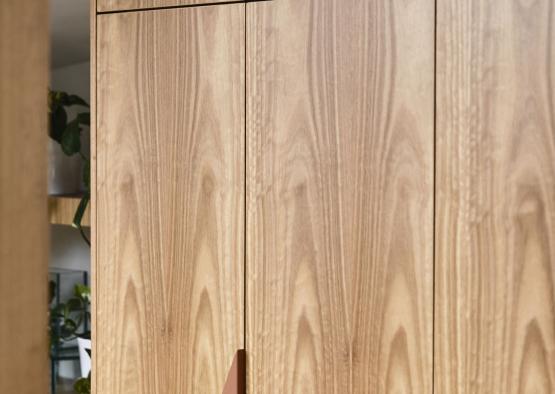 The transitional space between living and sleeping features a generous amount of cabinetry for storage and display. Joinery lines the length of the wall, with a refined palette of timber and tiles providing a layered backdrop for the couples’ combined landscape of artwork, furniture, plants and books. Tasmanian oak veneer was used for the joinery, which is an excellent budget option with an amazing finish.