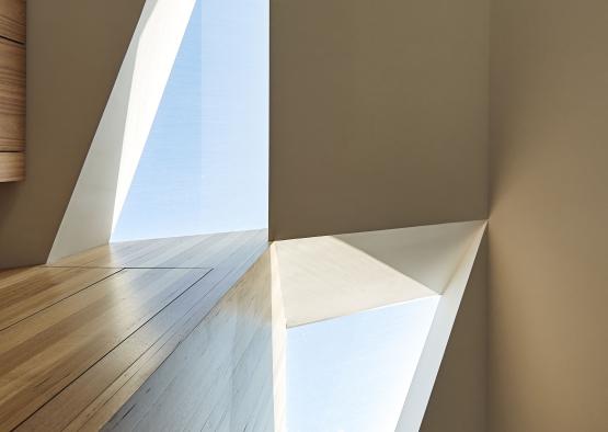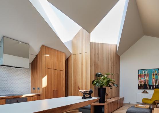 The pitched ceiling gives a grand sense of scale and volume, punctuated by two timber framed triangular skylights, which culminate in the two shapes coming together- referencing the coming together of the clients’ love.