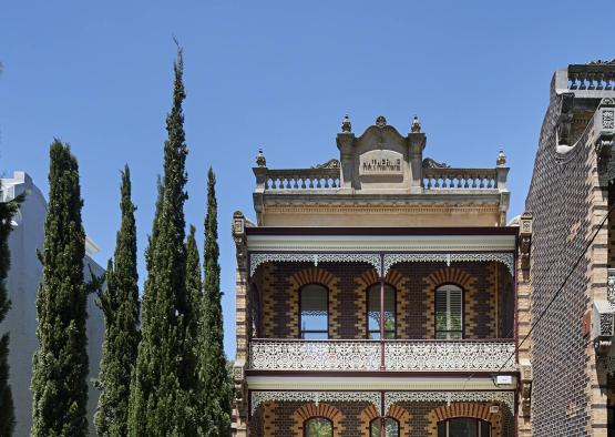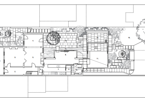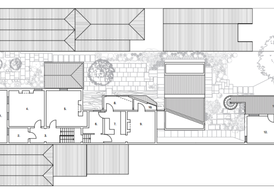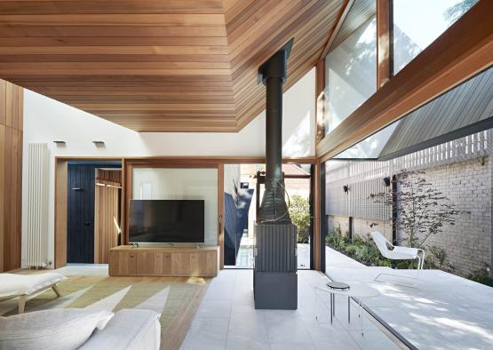 Hatherlie is a late 19th century terrace house of individual heritage significance, located in the inner city suburb of North Fitzroy. The house sits on a double width block at the bend of the street near the top of a hill, and is a distinct presence with a front garden lined with pencil pines. The additions include new living, kitchen, meals, laundry and study areas, while the front portion of the house was fully restored. Landscape is a key component of the design, knitting the heritage building to the contemporary extensions. The built interventions incorporate a formal geometry that creates varied spatial experiences, expansion and contraction horizontally and vertically, reinforced by a series of stepped courtyards. The new living room extension mirrors the roof profile of the gabled roof of the front façade and becomes a raised platform, analogous to a hill, offering extended views to the garden.