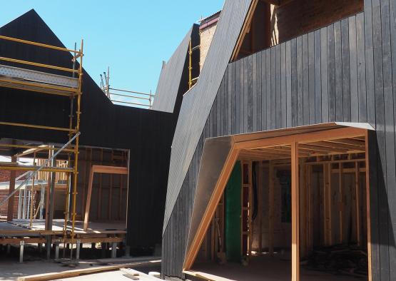 Various measures were employed to obtain a sustainable outcome by extensively incorporating timber into the project. These measures included the use of external charred silvertop ash cladding, internal solid cedar wall linings and solid American oak flooring and joinery. Timber was selected as it has relatively good insulating properties which improved the thermal efficiency of the existing building and new extension. The timber species selected were primarily locally sourced, native products therefore reducing the total embodied energy of the project.
