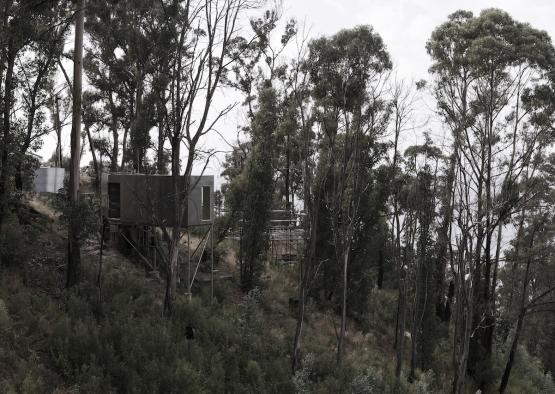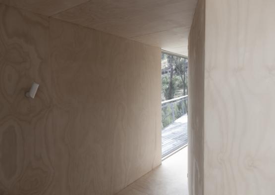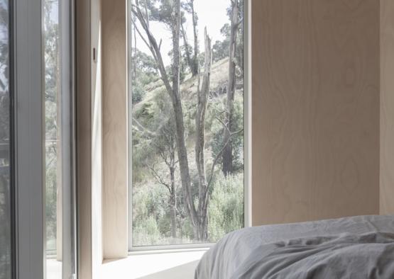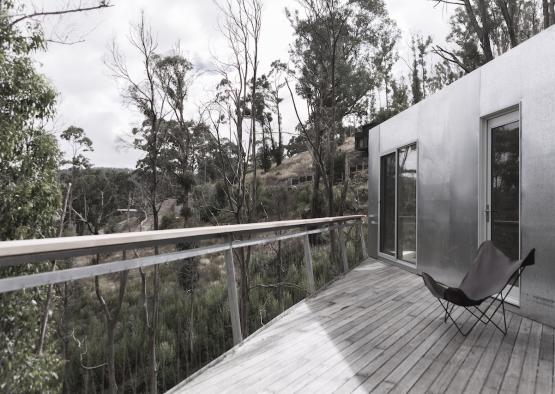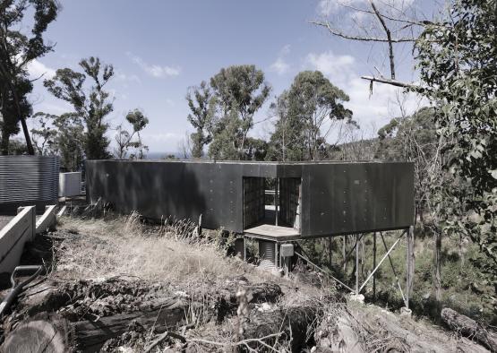 The small 70m2 dwelling sits perched on thin steel columns set in concrete footings, anchoring the structure to the steep hillside. The structure has a very light footprint, with almost none of the structure itself touching the site.