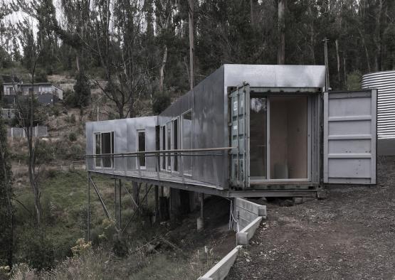 The linear circulation of the containers creates an atmosphere more of cabin than house. The master bedroom is accessed via the second bedroom, and all other rooms are also accessed linearly.