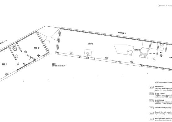 Internally, the containers are lined with a marine grade 9mm plywood fixed by countersunk screws to 70 x 35mm timber battens. Areas of the wall with less apertures have been lined with a minimum R2.5 insulation behind the ply.