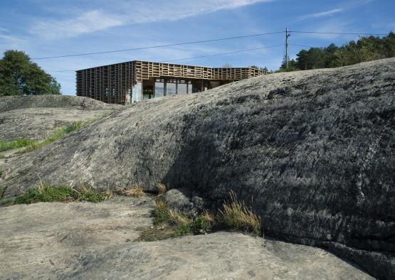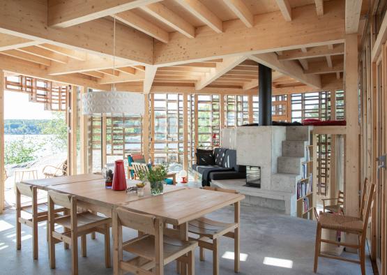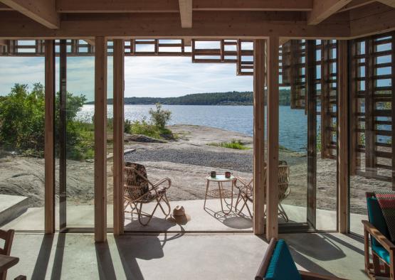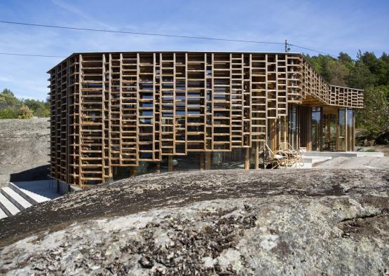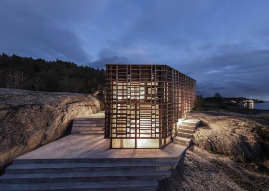 The small home is located on an isolated island off the south coast of Norway. The engineered timber frame and timber screen evoke the feeling of looking through trees in a forest, providing a calming sanctuary amongst nature.