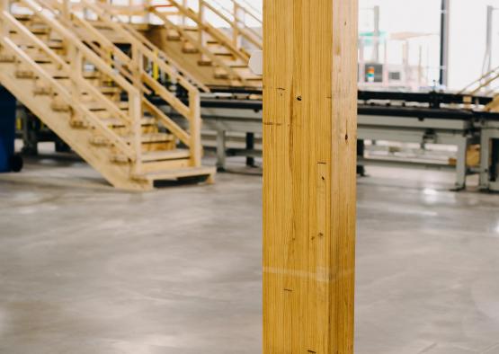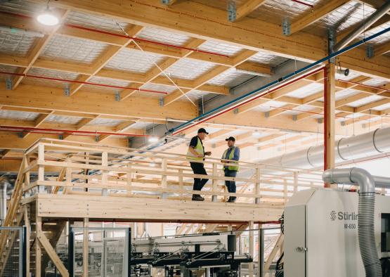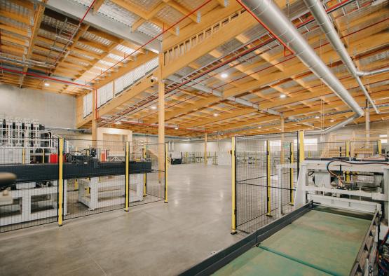 Built on a concrete slab foundation, the concrete has been left exposed along with all services, in keeping with typical industrial construction tropes. The internal timber columns have been expertly designed to fit snugly into bays of machinery, and provide a reference for the timber sections that are produced within the factory.