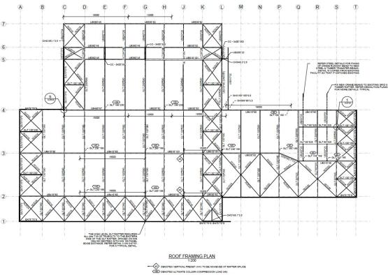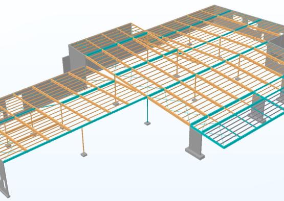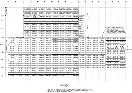 Glue laminated timber (glulam) products were used extensively within the roof and vertical support structure. In the roof structure, glulam beams were used for rafters, purlins, crane support beams, bracing struts and bridging (blocking) members. The vast majority (75%) of the internal warehouse columns were also glulam post sections. These glulam members were used throughout the warehouse to replace structural members that would have otherwise typically been structural steelwork or cold formed steelwork.