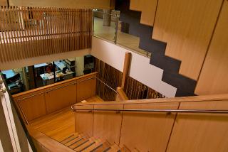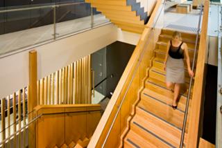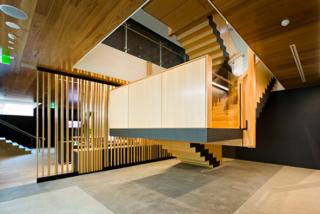 The visual centre of the entrance foyer is a freestanding staircase that travels up the three stories of the building. Timber was the clear preference for the stairs due to the warmth and range of textures that it presents. The designers wanted to express the flights and landings as lightweight elements, and timber was used to conceal the supporting elements as much as possible. Half landings were cantilevered from the central support and flights were suspended from floor slabs rather than propped with columns. Glass was used as balustrades at each floor level to reveal the timber stair.