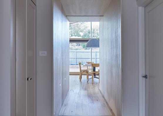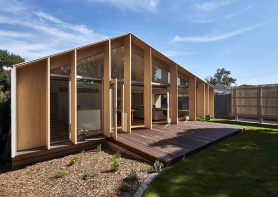 The garden is framed by a timber battened screen and seat that also creates a segregated utility area. The East facing façade utilizes an innovative structural system of laminated pine blades that are placed on the outside of the building envelope, enabling expansive glazing to the rear garden. The stained blades are simultaneously structure, finished surface and sun shading. No additional lining, substrate or embellishment is required. Both the laminated timber blades and LVL framing used for the roof and floor structure are fabricated from certified Radiata pine plantations and make highly efficient use of timber. The timber blade system enables the internal envelope to follow the external envelope.