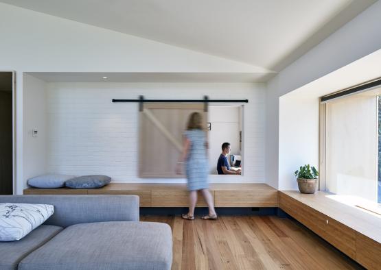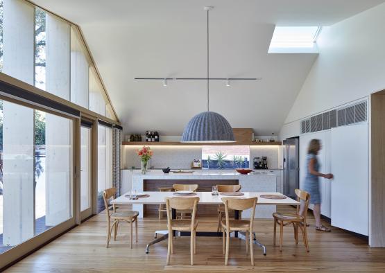 The subsequent cathedral ceiling captures heat at the apex of the ceiling, which forms a heat bank in winter. In summer, an automated double glazed argon filled skylight at the ceiling apex opens to release any trapped warm air and draws cross flow ventilation from the doors and louvred window at the base of the space.