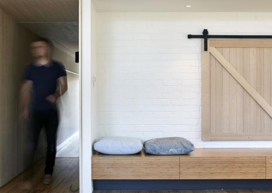 The interior features a series of framed views out to the garden that are enhanced by the timber blades and surrounding plywood paneling, cabinetry and a solid timber sliding panel.