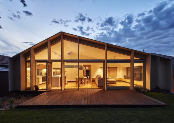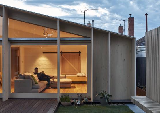 This project for alterations and additions to a detached 1960s suburban residence draws inspiration from the shape of lean-to structures prevalent at the rear of post war middle suburban houses.