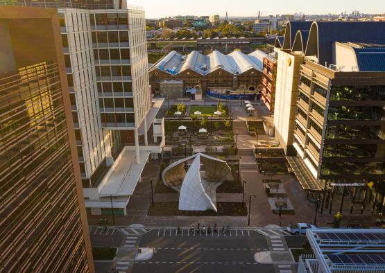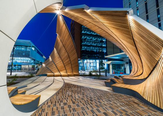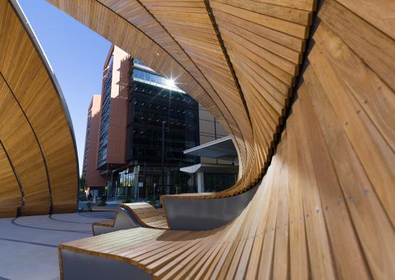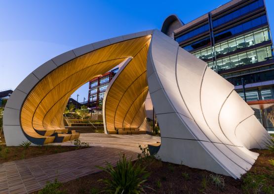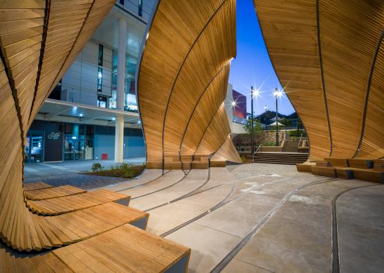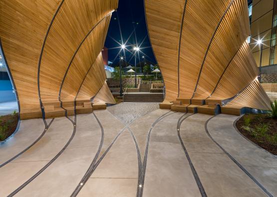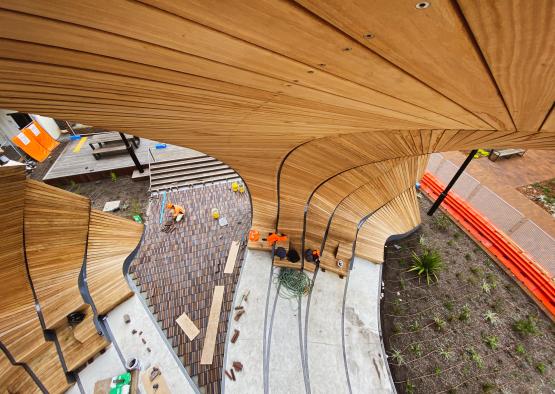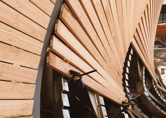 The surface of the structure is doubly- curved, like a distorted helix, which is a complex shape to clad with planar timber elements. The surface pushes the boundaries of timber geometry, peeling up from the ground, arcing overhead, before re-converging at a singular point at the apex.