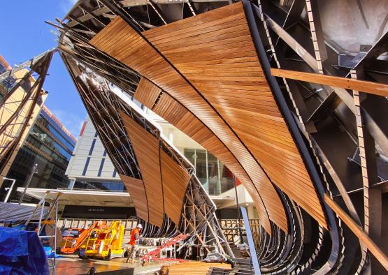 The execution of the geometry required complex parametric modelling, in order to uniquely detail every detailed connection between the timber pieces and supporting structure.