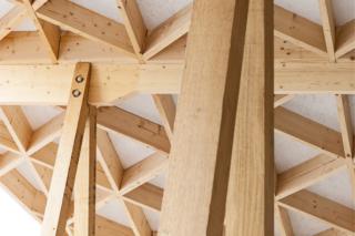 The structure is supported by a set of ten ‘quadrapods’ – doubled A-Frame supports - made from green oak. As well as incorporating bench seating or a table, they carry the load of the canopy via glulam beams, which project from the roof to form a wing-shaped rainspout.