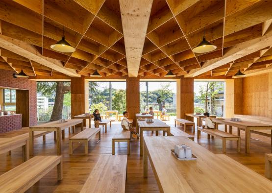 An exposed plywood waffle ceiling provides an extremely sculptural approach to structure. Huge engineered timber beams run through the waffle ceiling, which feels extremely lightweight given its long span.
