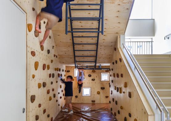 A plywood lined bouldering zone under the stair provides a respite and playful zone for the students to step away from the intensity of learning and re-calibrate.