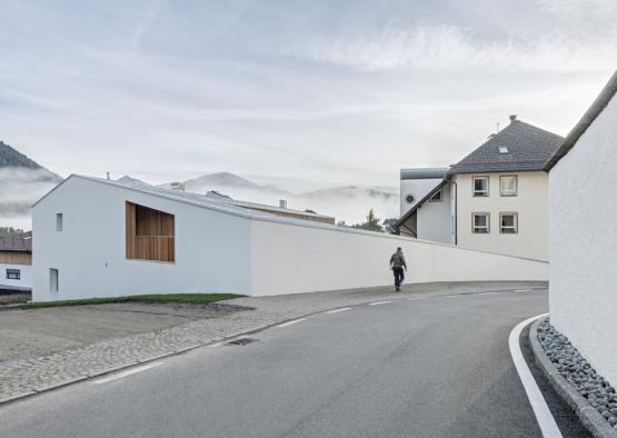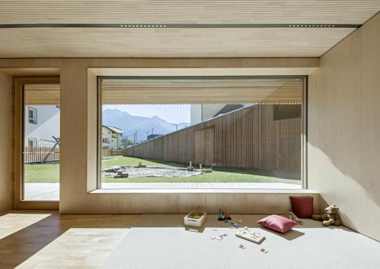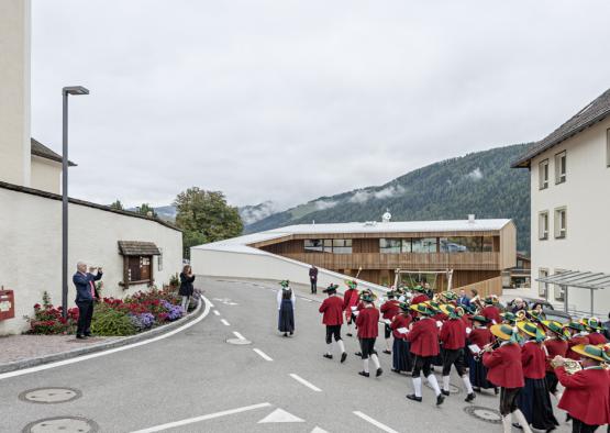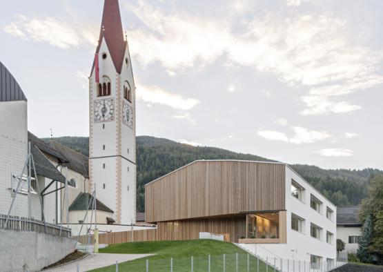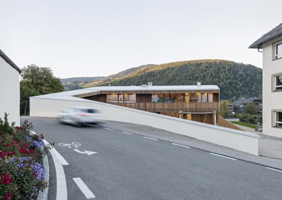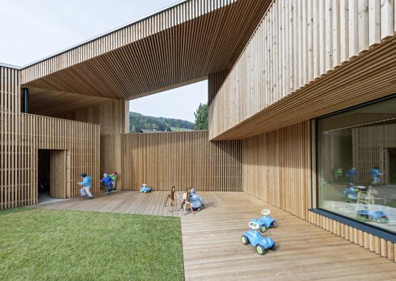 The house for a kindergarten in Valdaora di Sotto, South Tyrol, illustrates the local mesh of tradition, contemporary life and nature within the slowly grown village structure. This third kindergarten designed by feld72 aligns itself to the setting, without being subordinate to it. Subtly placed, the structure responds to the predominant presence of the parish church with its cemetery chapel and the elementary school in the village centre. The timber building is surrounded by a solid wall, as if it were sitting in a case. Together they provide a hideaway. Here, a place for children and the village community is the interface for tradition and modernity. The familiar and the exceptional together find a home in Valdaora di Sotto.