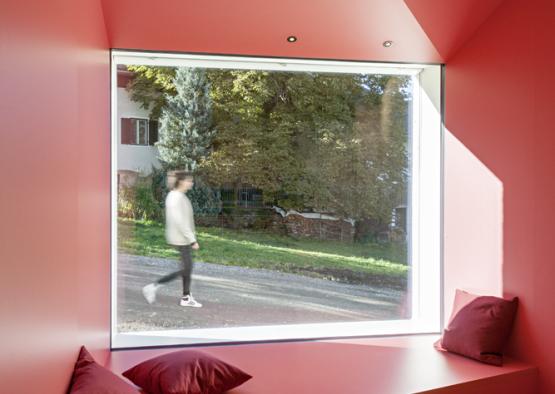The wall is of varied materiality and volume, since it changes from garden fence to boundary wall, an interpretation as much as an elaboration of the existing. Inside the courtyard it shows itself entirely in wood and in a friendly gesture embraces the garden. Roofed, weather-protected areas are set up in the passage to the building. The handling of the wall as an architectural element unfolds in a playful way, architecture and playground fuse. The traditional element of fencing-in a property gains in complexity and quality – it shelters, frames, invites to play and presents insights and outlooks. The building itself remains clear and yet manifold.