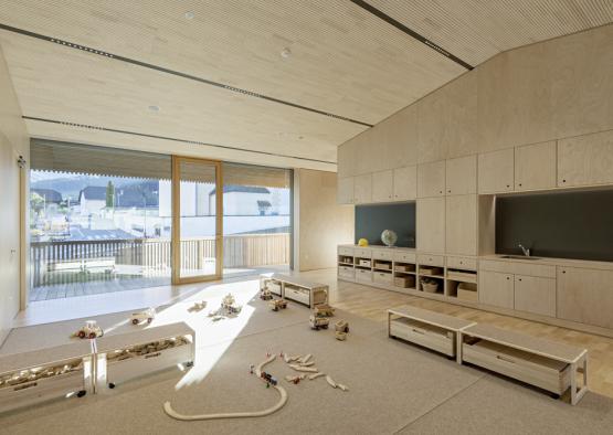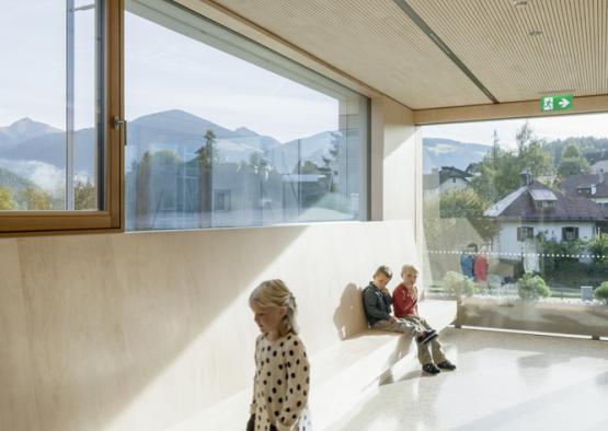 Uniform materiality displays simplicity. Plastered brickwork and wood prevalent inside the kindergarten create identity and a sense of belonging. A warm and easy atmosphere is generated within the interiors thanks to the subtly complex use of local timber. For the children, the group rooms represent the starting point of their daily explorations. The rooms are designed to be unpretentious and calm, providing space for individual changes. Small areas for retreat are offered by the large window recess or the accessible partition furniture leading to the cloakroom. The assembly room and multi-function rooms can be used connected or individually. On both levels, the suggested spatial concept enables attractive variations in the educational approach.