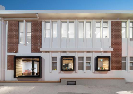 Delicate structural work was undertaken to minimise impact and drastic shifts to the old building’s programming. The existing facade has been modernised, with NAUU creating new openings that invite passersby to approach. The varied back-lit openings reference ‘vitriles’- glass cases for displaying precious items. The openings form both practical display, internal seating, and a timeless reference to the buildings heritage.
