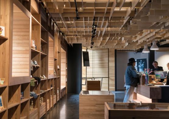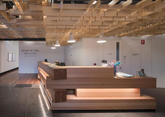 Both locally crafted and digitally fabricated timber construction is the focus of the interior palette. The natural beauty of the timber and its joinery is very much on display through the lobby and cafe area of the gallery. Modular joinery and a sculptural, though practical ceiling are seen throughout. The lightweight complex geometry of the ceiling is contrasted with huge beams of timber laid on top of one another like jenga. The digital techniques used for the ceiling allowed a simple installation and CNC fabrication process. The individual pieces were cut to size, ID tagged and flat-packed, before being shipped to site. This cut a lot of cost compared to on site construction of such a complex ceiling. The complex form becomes part of the show, whilst also operating more practically as acoustic baffling.
