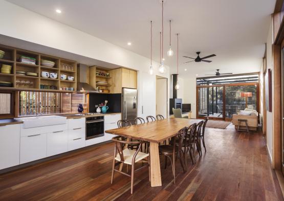 The Light House is a pared back home with timber inherent within every building element. Designed to maximise the use of timber, both inside and out, the project features hoop pine joinery, western red cedar windows, spotted gum flooring and hardwood trims and feature elements. The building includes a timber vented cavity wall system delivering high thermal performance and cladding to blend seamlessly into its coastal environment.